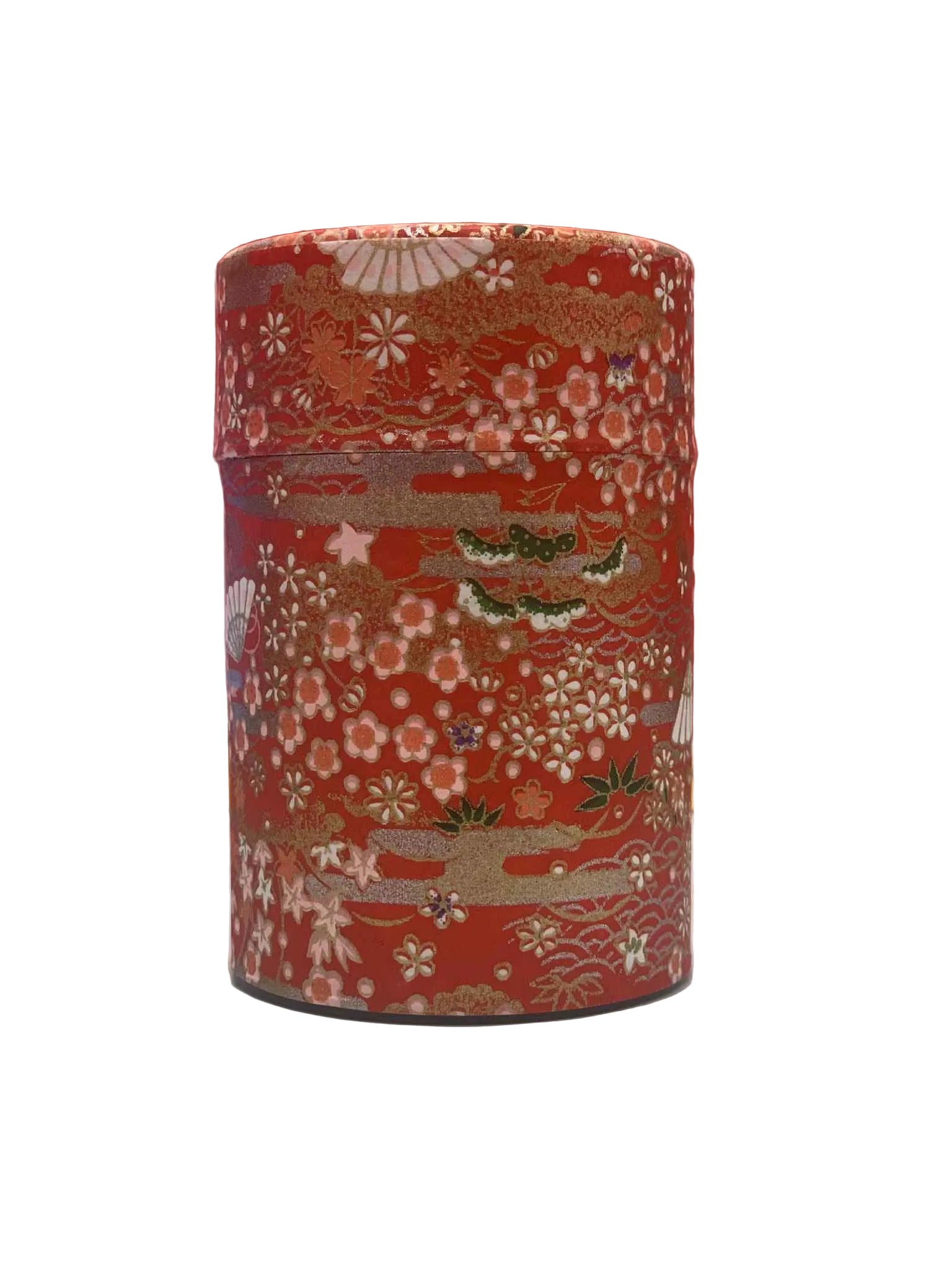 This tall chazutsu (tea canister) is made from tin-plated steel and wrapped with red Sakura flowers washi paper decorated with fans.