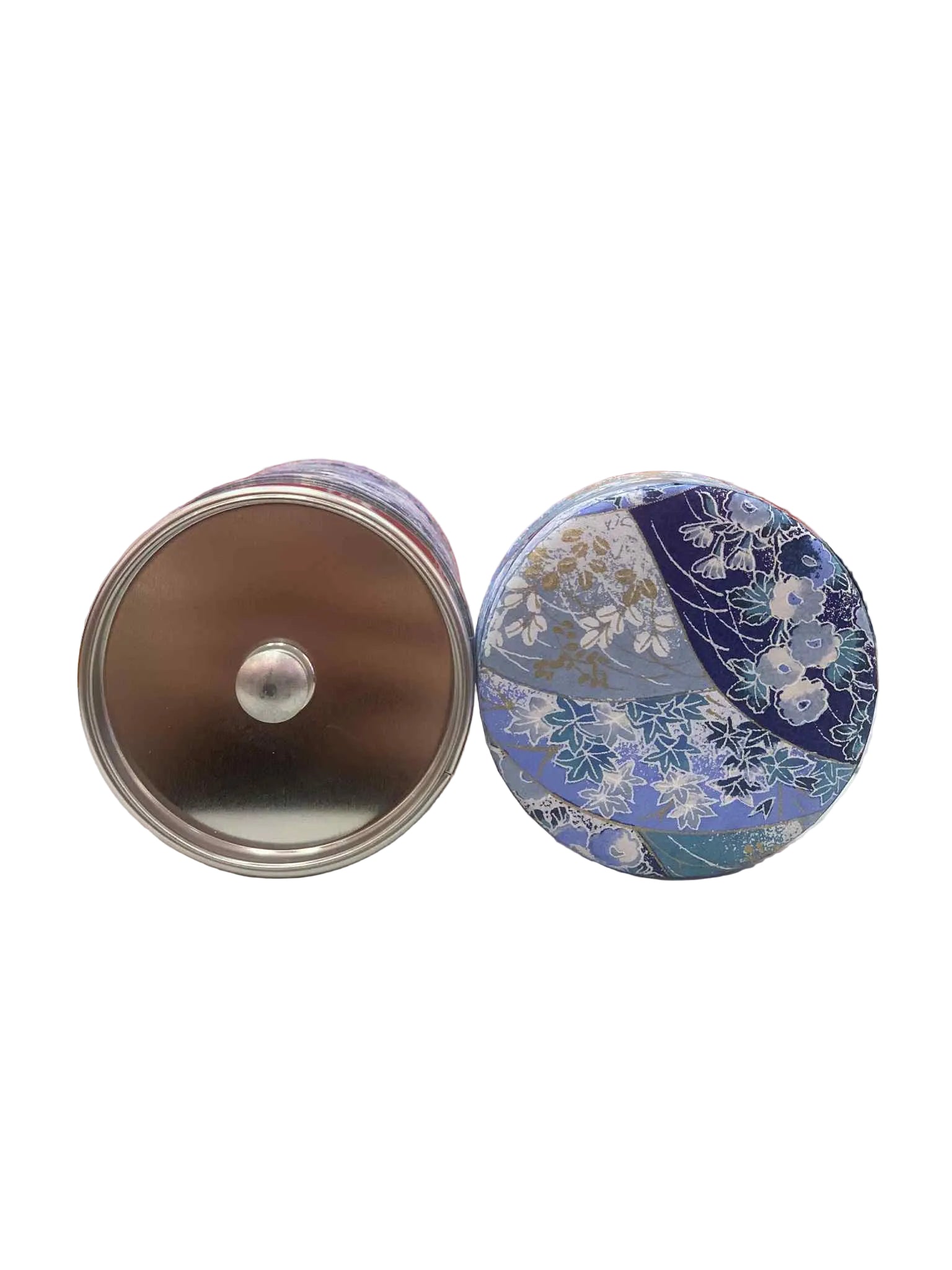 This tall chazutsu (tea canister) is made from tin-plated steel and wrapped with Sky Blue Fans& Flowers Pattern washi paper,